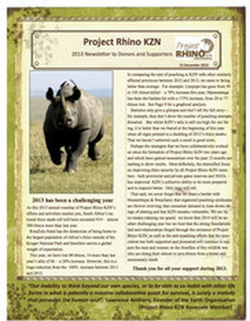 The picture of the dog on page 3 is of Chloe. She is the dog we bought and trained and then donated to the anti-poaching unit. We have also purchased anti-poaching equipment, started contributing to the rhino art competitions in schools and the Zap Wing project.